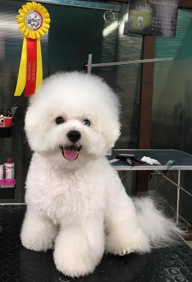 Il collo alto e il portamento fiero, il pelo riccio di colore bianco candido e non ricadente che si presta ad essere toelettato con la classica testa tonda