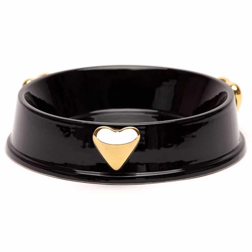 Ciotola per cani in ceramica nera con applicazione d’oro a cuore.