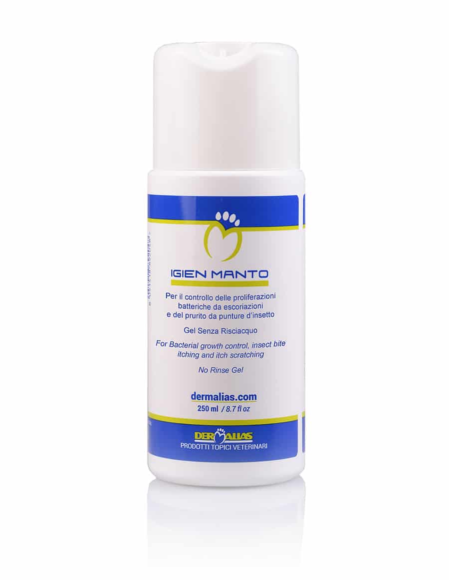 DERMALIAS IGIEN MANTO è un gel idroalcolico a base di Cloruro d’Alluminio con spiccata azione astringente, antimicrobica e antipruriginosa. Il suo utilizzo permette di asciugare le vescicole e le bolle, ridurre la crescita batterica e diminuire il prurito. Utile nel trattamento delle dermatiti umide (intertrigine) e nella piodermite delle pliche.